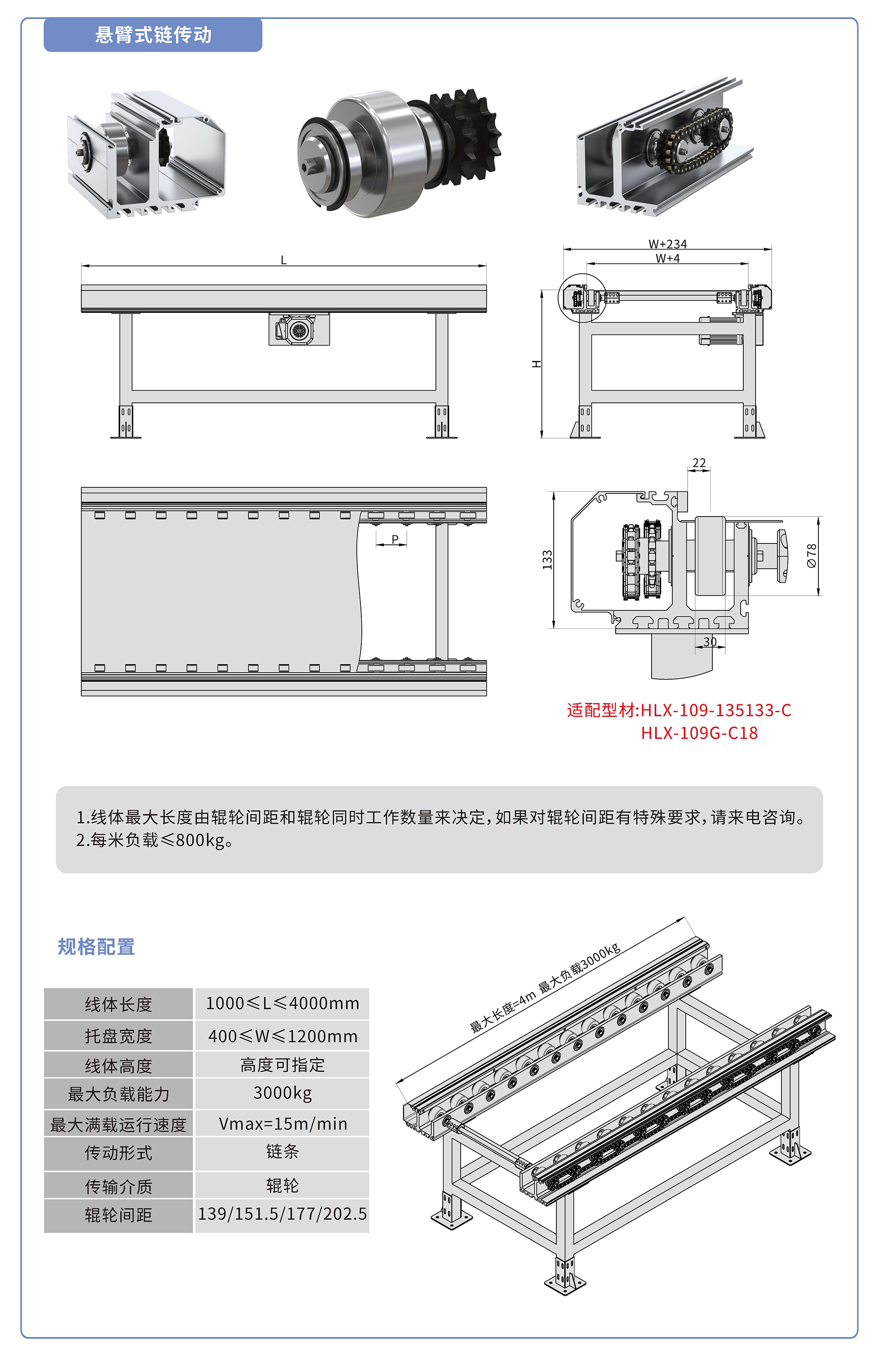 采用135133鋁型材,鏈輪傳動(dòng),鍍鉻滾輪鑲嵌銅套實(shí)現(xiàn)積放功能,負(fù)載3000kg/米,最大負(fù)載速度15M/min, 輪距139、151.5、177、202.5可選,適用托盤(pán)寬度400-1200mm,線體長(zhǎng)度范圍1000-4000mm, 高度根據(jù)需求定制.