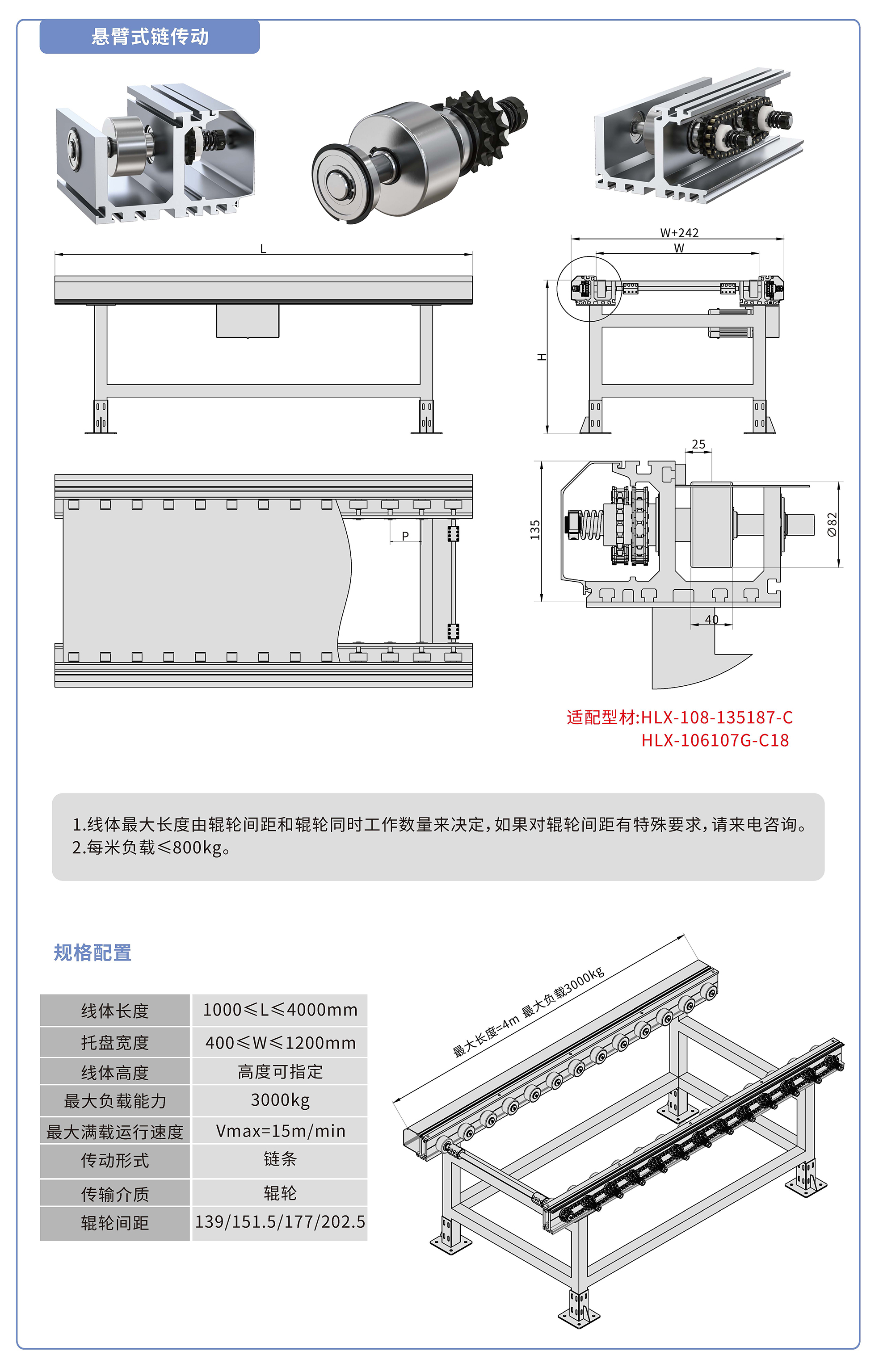采用135187鋁型材,鏈輪傳動(dòng),鍍鉻滾輪鑲嵌銅套實(shí)現(xiàn)積放功能,負(fù)載3000kg/米,最大負(fù)載速度15M/min, 輪距139、151.5、177、202.5可選,適用托盤寬度400-1200mm,線體長(zhǎng)度范圍1000-4000mm, 高度根據(jù)需求定制.