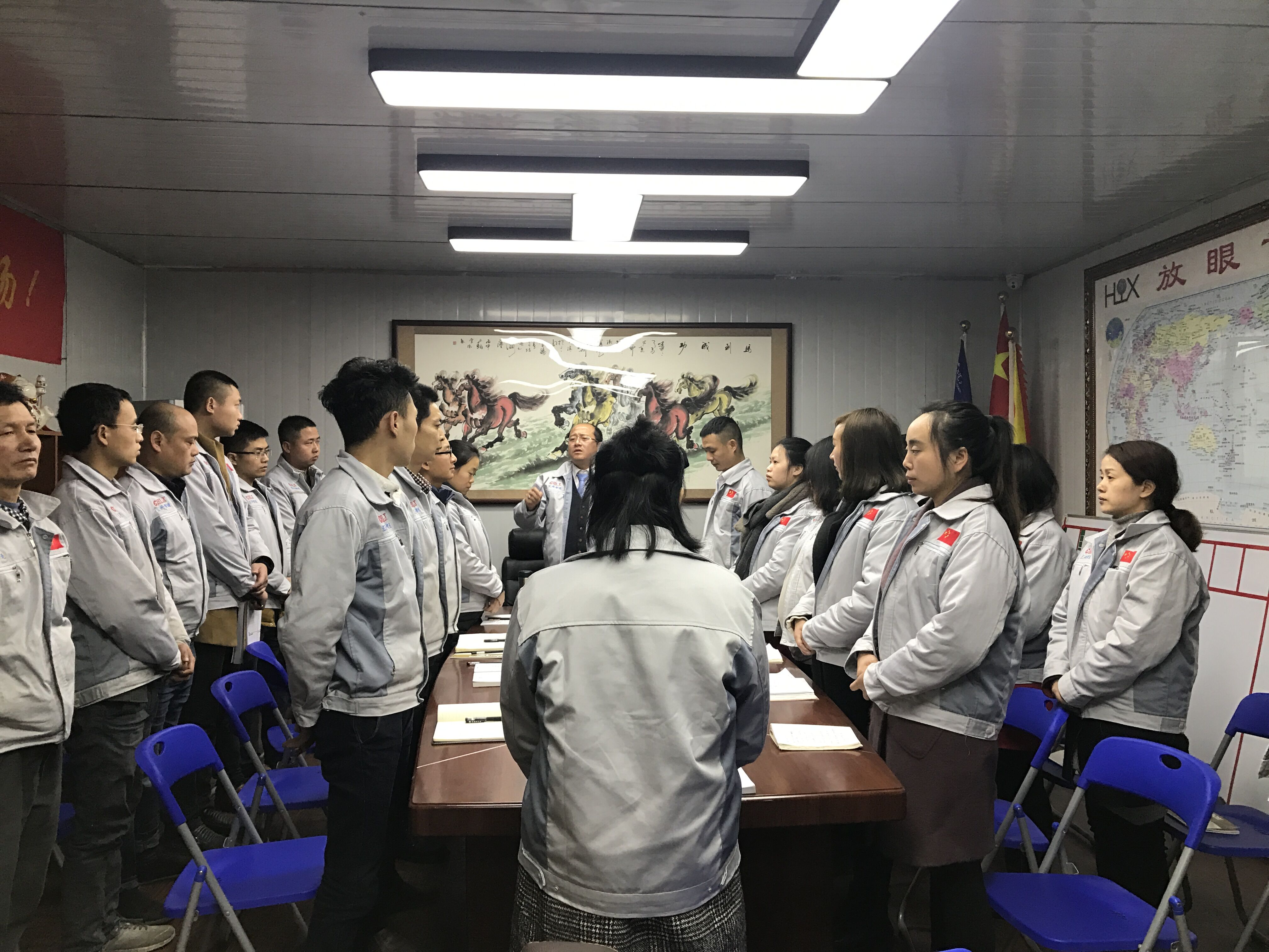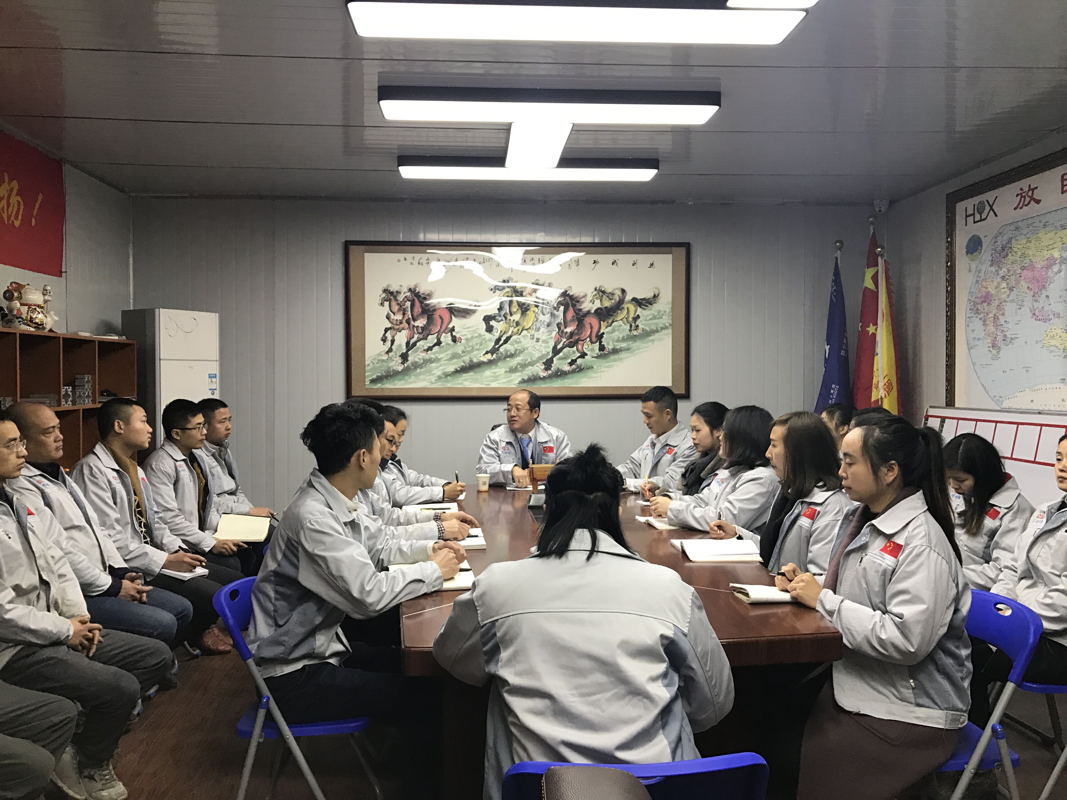 2月27日,匯興智造董事長(zhǎng)鐘輝先生蒞臨重慶匯利興子公司考察并指導(dǎo)工作。重慶子公司全體人員對(duì)鐘董事長(zhǎng)的到來(lái)表示熱烈歡迎,并于12點(diǎn)30分由鐘董事長(zhǎng)領(lǐng)導(dǎo)召開(kāi)會(huì)議。 鐘董事長(zhǎng)在會(huì)議上做相應(yīng)會(huì)議的闡述 展望未來(lái)、登高望遠(yuǎn)。會(huì)上,鐘董事長(zhǎng)首先提到兩個(gè)特質(zhì)“智慧與力量”,進(jìn)而談到企業(yè)的擁抱變化及展望未來(lái),并切身實(shí)際談到匯興智造所擁抱的變化及所具備的十三大體系的升級(jí)(客戶、產(chǎn)品、設(shè)備、工具、管理、名字、品牌、宣傳等);進(jìn)而也公布公司近段時(shí)間一系列喜訊事宜并讓我們感受到公司前進(jìn)步伐的節(jié)奏感及時(shí)效感,同時(shí)表示國(guó)家一系列政策對(duì)我司的大力支持與鼓勵(lì),并談及到平臺(tái)的力量,品牌的力量”。 全體人員用士氣唱響心中的船(匯利興) 鐘董事長(zhǎng)說(shuō)道:公司”倍增計(jì)劃”是以內(nèi)伸與外延相結(jié)合發(fā)展進(jìn)而勉勵(lì)我們:在崗也應(yīng)在職,在職也應(yīng)在職,且人因夢(mèng)想而偉大,以走一步看兩步想三步為理念朝著目標(biāo)努力奔跑。隨機(jī)應(yīng)變,有配而來(lái),整個(gè)會(huì)議以“匯利興是我們的船而我們?cè)诖稀钡膮群奥晝航Y(jié)束,但那一聲聲強(qiáng)大的聲音滲透在匯利興人每個(gè)人的腦海,將永不停歇。