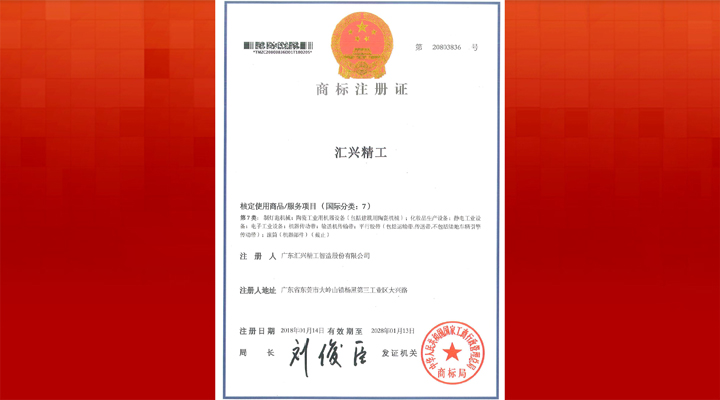 陽(yáng)春三月,萬(wàn)物復(fù)蘇。廣東匯興精工智造股份有限公司的喜訊就如鮮花綻放、嫩芽出頭,一個(gè)接一個(gè),讓人應(yīng)接不暇。3月13日,一份商標(biāo)注冊(cè)證書(shū)飄然而至。這為“匯興精工”的商標(biāo)注冊(cè)證書(shū)已經(jīng)是中華人民共和國(guó)國(guó)家工商行政管理總局商標(biāo)局為匯興智造簽發(fā)的第9份商標(biāo)注冊(cè)證書(shū)。 匯興智造立志成為中國(guó)領(lǐng)先的整廠自動(dòng)化系統(tǒng)解決方案提供商,一直不忘初心,不斷優(yōu)化產(chǎn)品質(zhì)量,堅(jiān)持研發(fā)攻克新技術(shù),打造開(kāi)發(fā)新產(chǎn)品,加速轉(zhuǎn)化新成果。在做大做強(qiáng)的過(guò)程中,強(qiáng)烈地意識(shí)到知識(shí)產(chǎn)權(quán)和品牌建立的重要性,所以,成立了知識(shí)產(chǎn)權(quán)部門(mén),投入大量人力、財(cái)力來(lái)保護(hù)自主創(chuàng)新、知識(shí)產(chǎn)權(quán)和品牌構(gòu)建。 商標(biāo)注冊(cè),為匯興智造樹(shù)立了品牌、建立了口碑。在每一個(gè)匯興人心中都有一個(gè)愿望,那就是打造一個(gè)“百年老店”。“創(chuàng)于手 精于工 智于器 匠于心 品于行”是匯興智造奉行的工匠精神,匯興人在匯興工匠精神的影響下,勤修內(nèi)功、精益求精地培育著匯興人心中的“百年老店”。 “十年磨一劍”,匯興智造以提升品質(zhì)為根本,下大力氣做真正的好產(chǎn)品,由產(chǎn)品制造走向了產(chǎn)品智造,將向精品制造進(jìn)發(fā),提高品牌的含金量,做出 “匯興百年老店”的金字招牌。(轉(zhuǎn)載匯興智造http://www.huixinggroup.com)