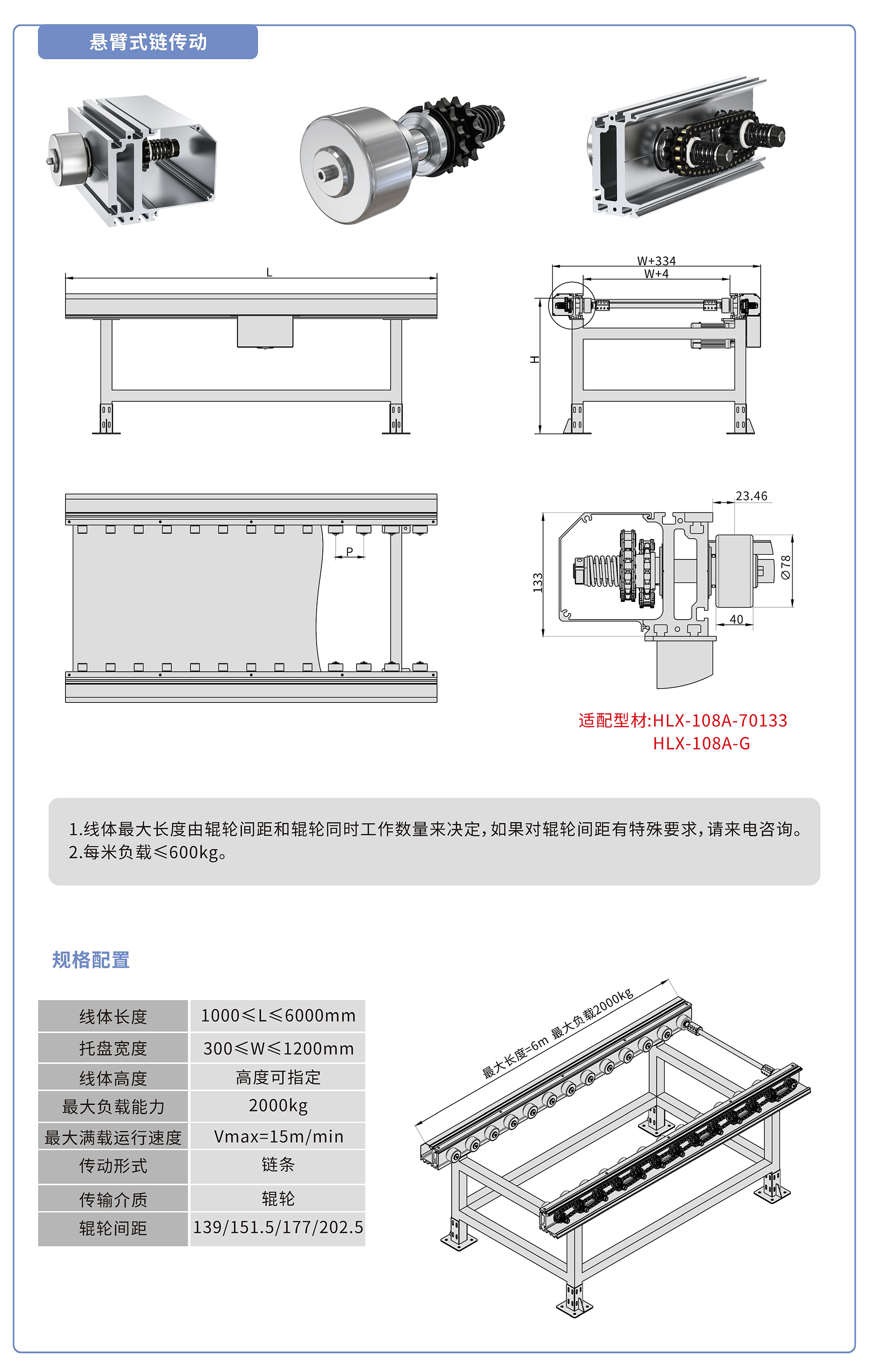 采用70133鋁型材,鏈輪傳動,鍍鉻滾輪鑲嵌銅套實現(xiàn)積放功能,負載2000kg/米,最大負載速度15M/min, 輪距139、151.5、177、202.5可選,適用托盤寬度300-1200mm,線體長度范圍1000-6000mm, 高度根據(jù)需求定制.
